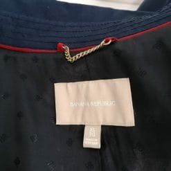 Banana Republic trench blu notte in cotone, foderato, doppiopetto con cintura. Taglio elegante e tradizionale, all’interno ha dettagli rossi.