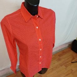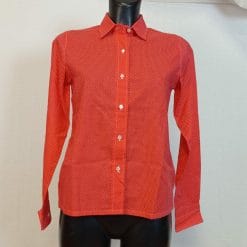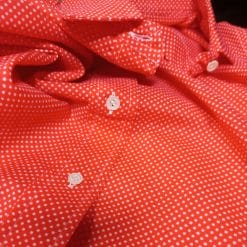 Camicia a pois bianchi su base rossa, versatile e comoda. In cotone.