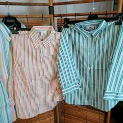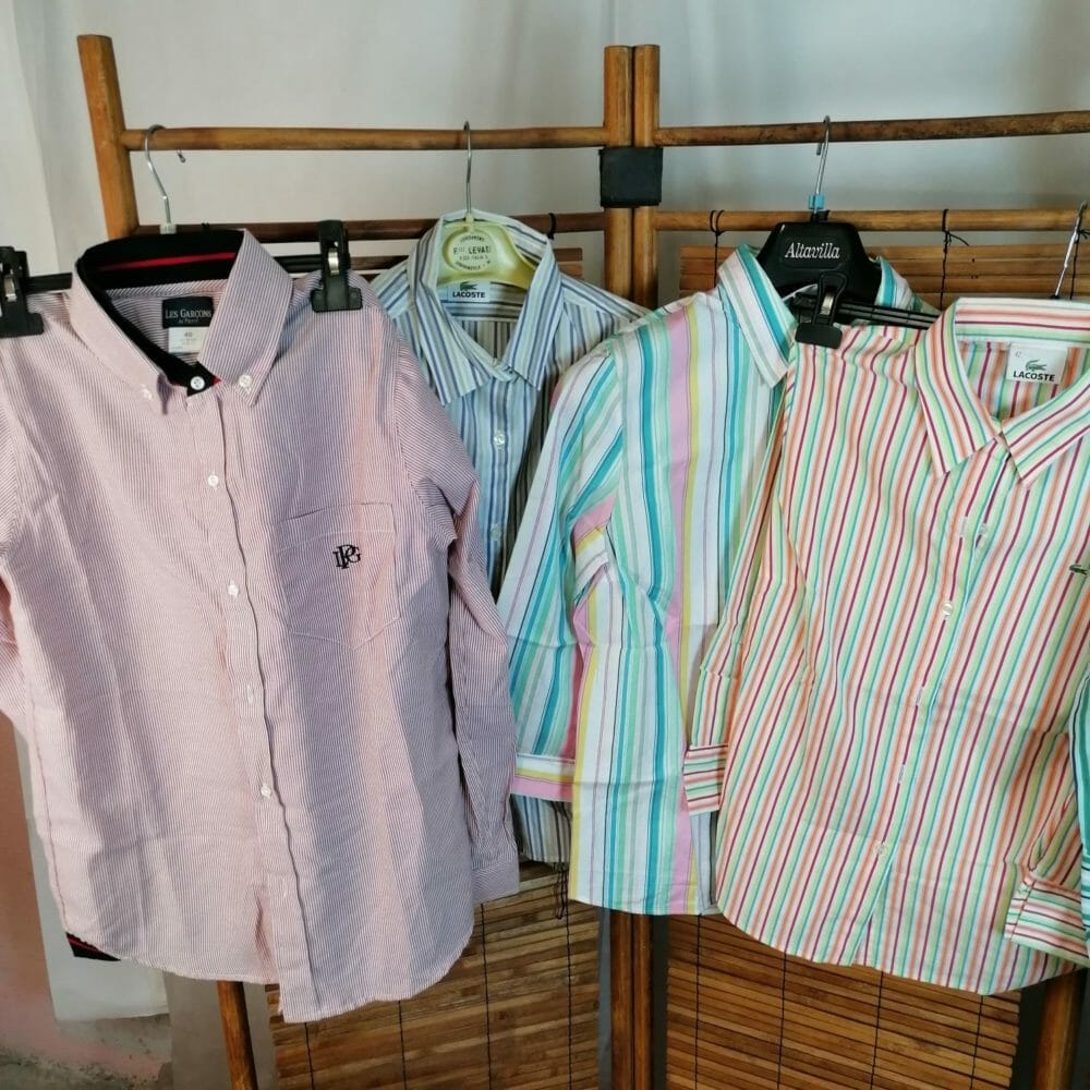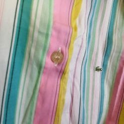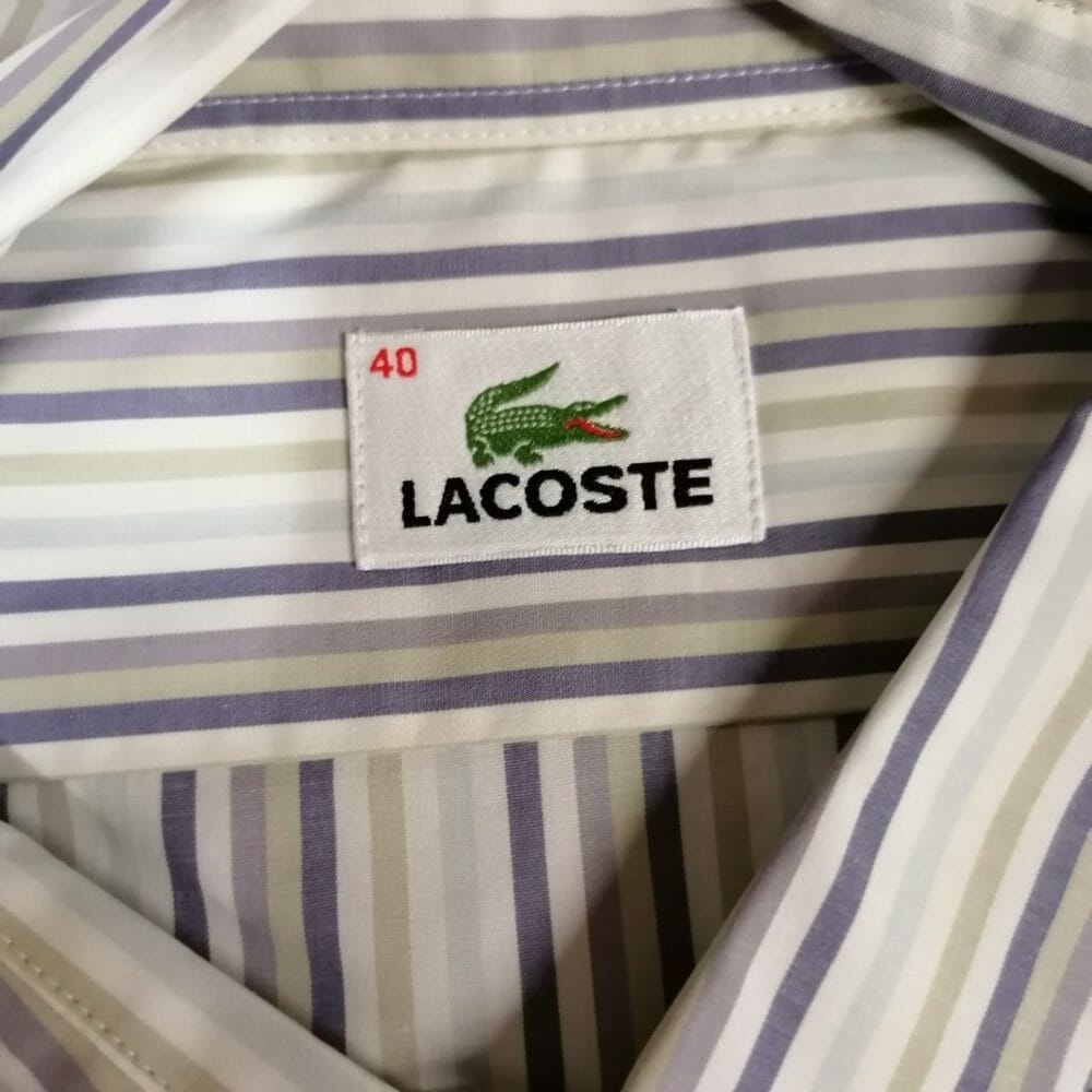 Lotto 5 camicie: 4 Lacoste a righe in cotone 98% e 2 % elastam + 1 camicia particolare Les Garsons button down 50% poliestere 50% cotone con doppio colletto.