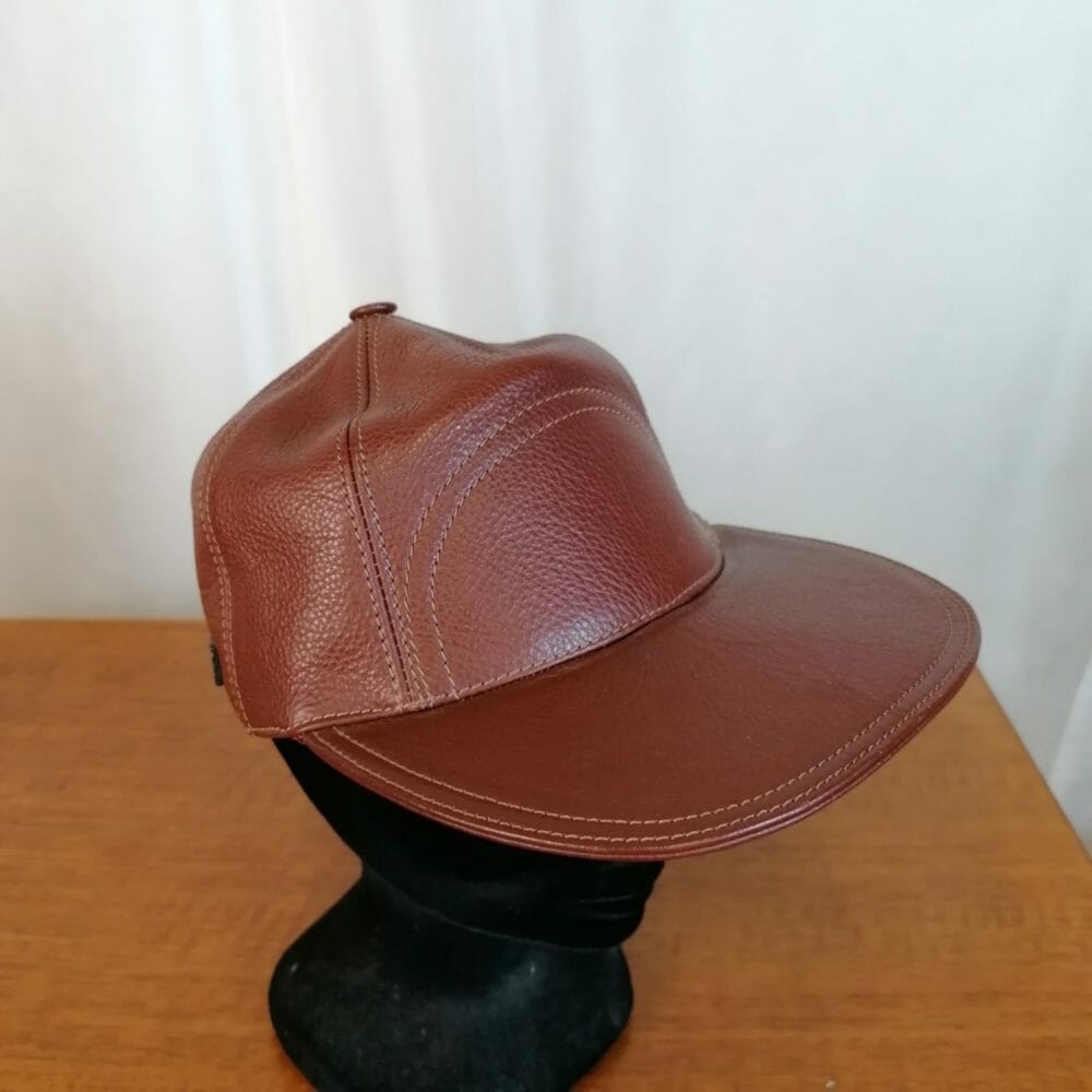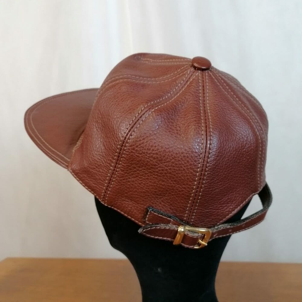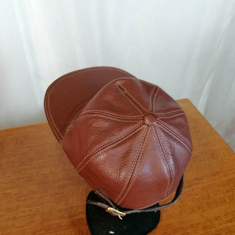 Berretto con visiera, in pelle marrone, vintage. Fodera rossa in cotone, cinghietta regolabile.