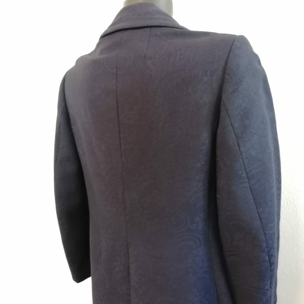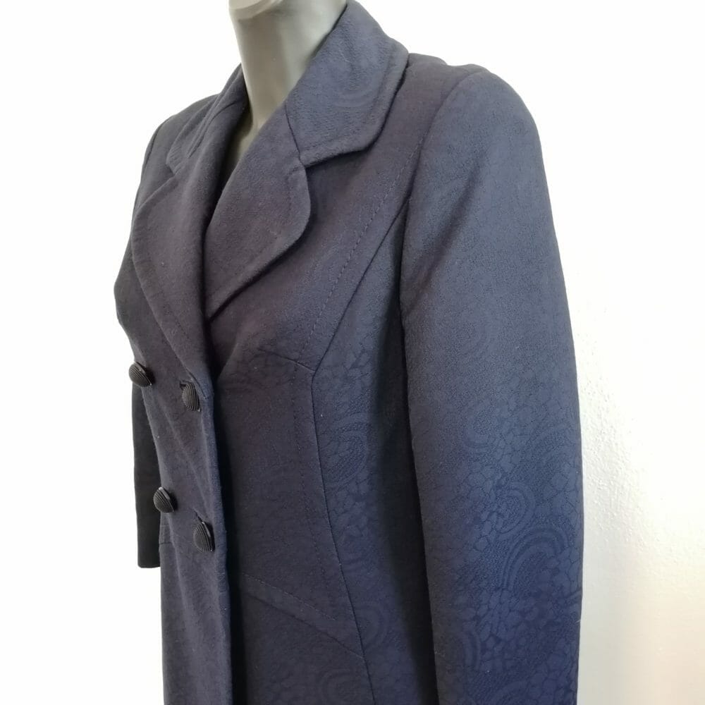 Vintage, cappotto leggero blu con tessuto particolare dal pattern cangiante, bottoni ricercati. Doppiopetto con taglio sfiancato, foderato.