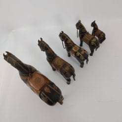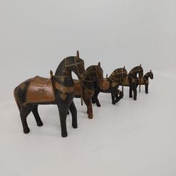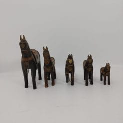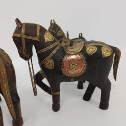 Le statuine in legno raffiguranti cavalli Marwari rappresentano un’eccellenza dell’artigianato tradizionale indiano. I cavalli Marwari, celebri per il loro portamento fiero e le tipiche orecchie ricurve, furono utilizzati dalle caste guerriere del Rajasthan e sono simbolo di nobiltà e coraggio. Le riproduzioni artigianali, spesso realizzate in legno intagliato a mano e decorate con rame e ottone sbalzato, uniscono bellezza estetica e valore culturale, rendendole pezzi ricercati nel modernariato e nel collezionismo etnico.