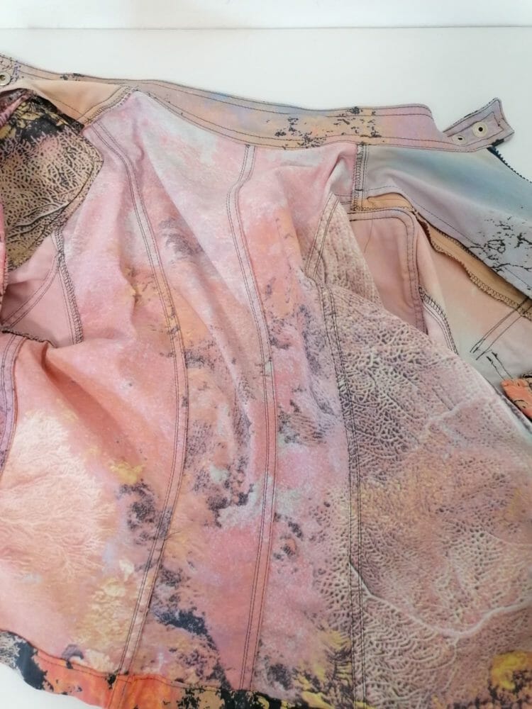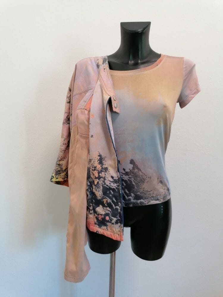 Cavalli Jeans completo giubbotto sfoderato e maglietta mezze maniche, bellissima fantasia con pattern naturale sui toni del rosa. Poliammide ed elastan.