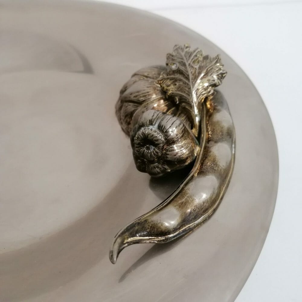 Bel piatto centrotavola / portafrutta vintage versatile e decorativo, in acciaio inox A1000, con decorazione di verdura (carciofo, baccello, aglio). Ha piedini sul fondo.