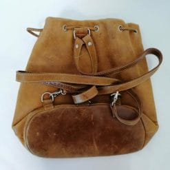 Charro zainetto anni 90 vintage in pelle, marrone effetto vissuto. Modello di zaino a secchiello con cordone per la chiusura, anelli per gli spallacci con moschettone.