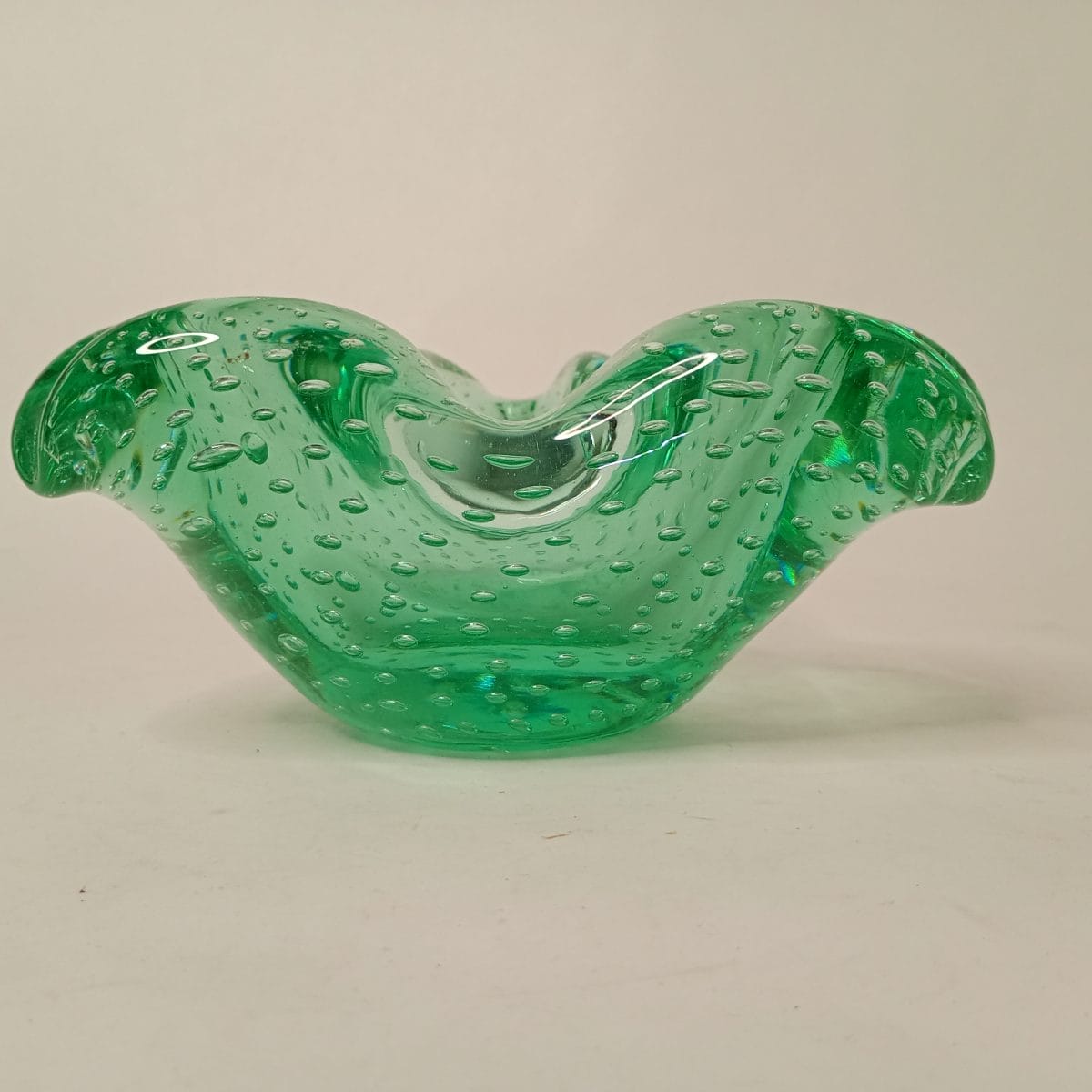 Elegante ciotola in vetro bullicante di Murano, realizzata a mano in Italia negli anni ’60. Questo raffinato oggetto vintage è caratterizzato dal tipico effetto “bullicante”, ovvero un controllo artistico delle bolle d’aria all’interno del vetro, che impreziosisce la trasparenza del vetro verde con un affascinante gioco di luce e profondità.