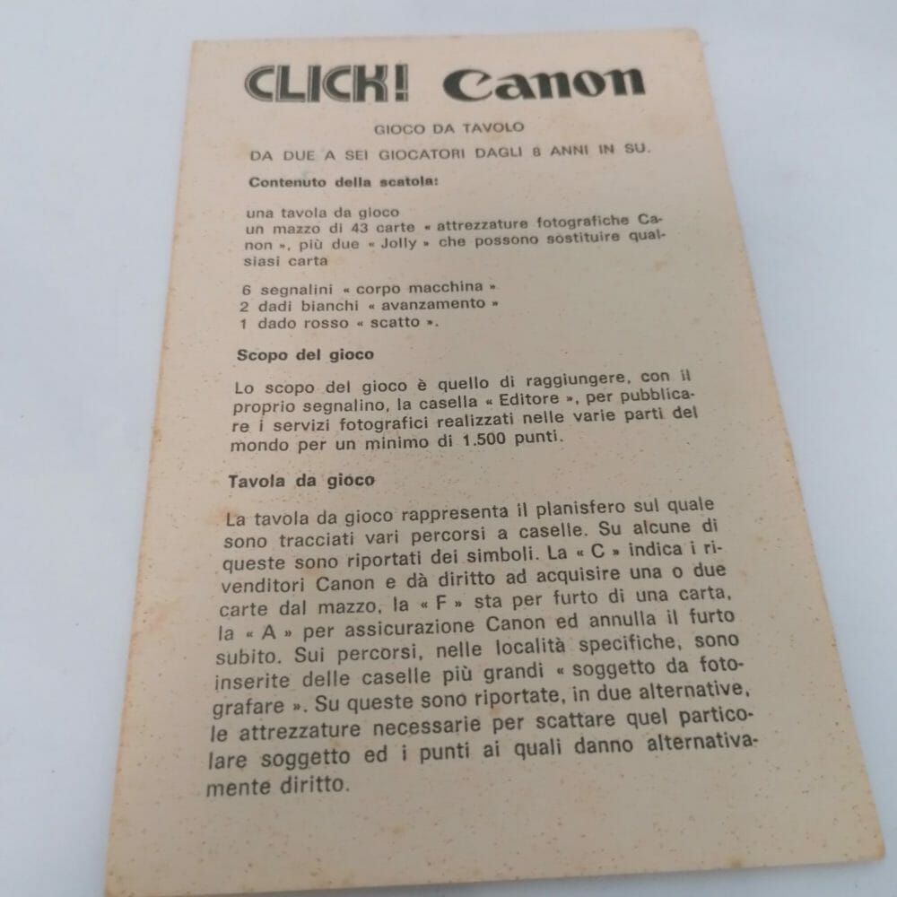 Gioco in scatola vintage Click! Canon del 1982, in ottimo stato, con scatola originale, catalogo Canon, libretto di istruzioni, segnalini, tabellone e dadi.