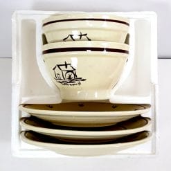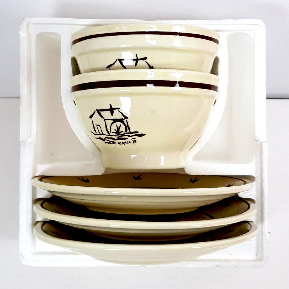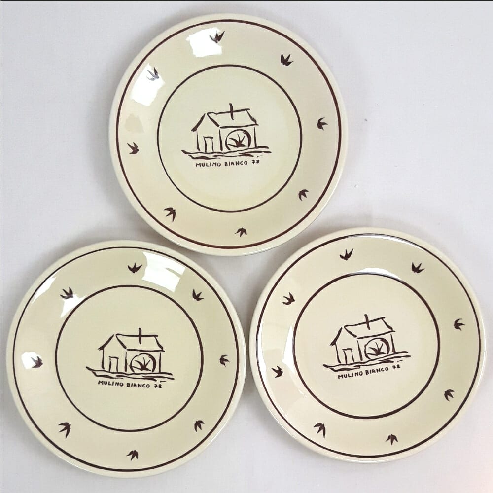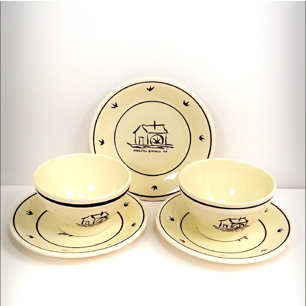 L’intramontabile “Coccio” del Mulino Bianco: la tazza per la prima colazione più ambita. Edizione del 1978, prodotta dalla famosa casacasa “Sangallo Ceramiche”, il set comprende tre piatti e, purtroppo, solo due tazze. Perfetto per fare colazione in coppia con il terzo piatto dedicato ai propri prodotti da forno preferiti.