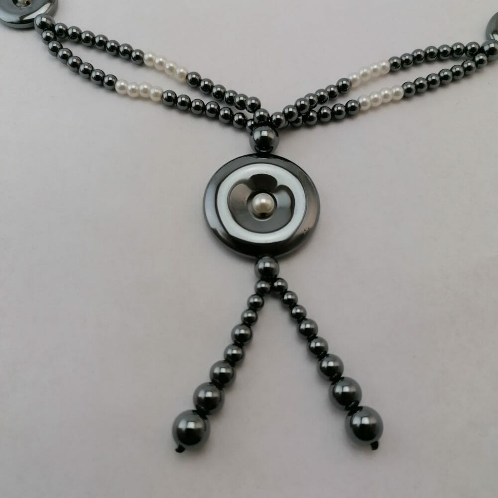 Collana in ematite con perle rotonde e ciondolo. Non si apre.