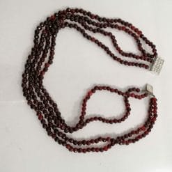 Elegantissima questa collana artigianale multifilo costituita da cristalli di granato, nel caratteristico colore rosso scuro che richiama i semi di melograno.
