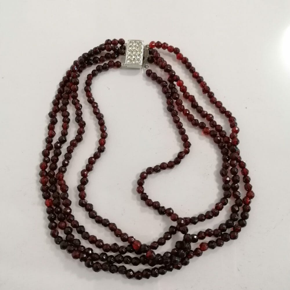 Granato, collana a 4 fili, la chiusura è decorata con zirconi. Aperta misura 42 cm, fattura artigianale.