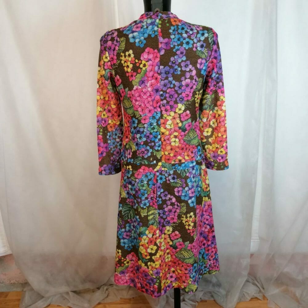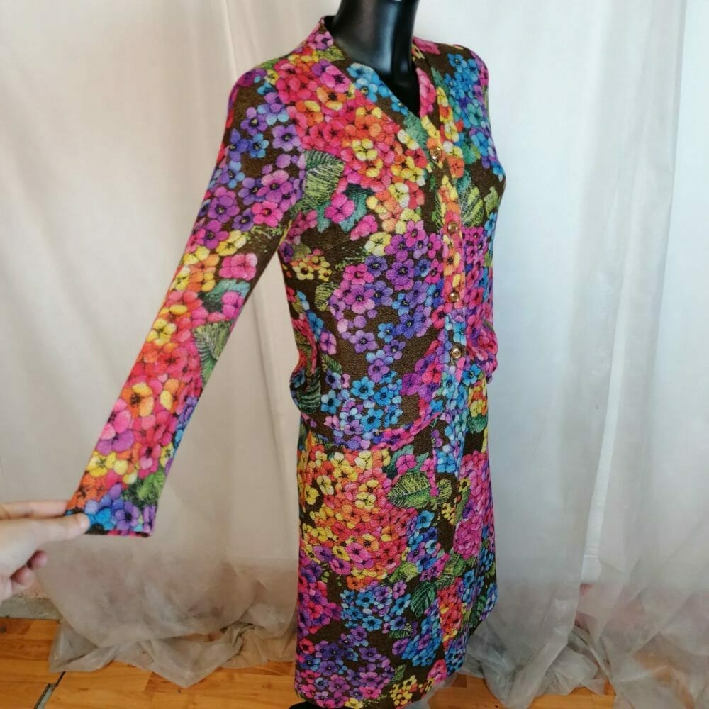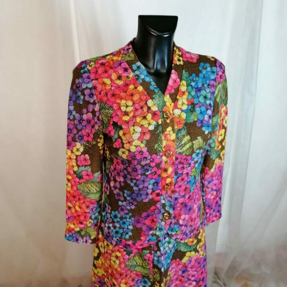 Mette allegria questo completo vintage di giacca e gonna con fantasia brillantissima di fiori. Il tessuto è ideale per la mezza stagione ed è un outfit perfetto anche da portare spezzato. Per gli ambienti di lavoro meno formali al posto del classico tailleur, per una serata fuori, per una gita: questa cascata floreale si adatta ad ogni circostanza con la classe di una linea sobria e il buonumore della palette variegata.