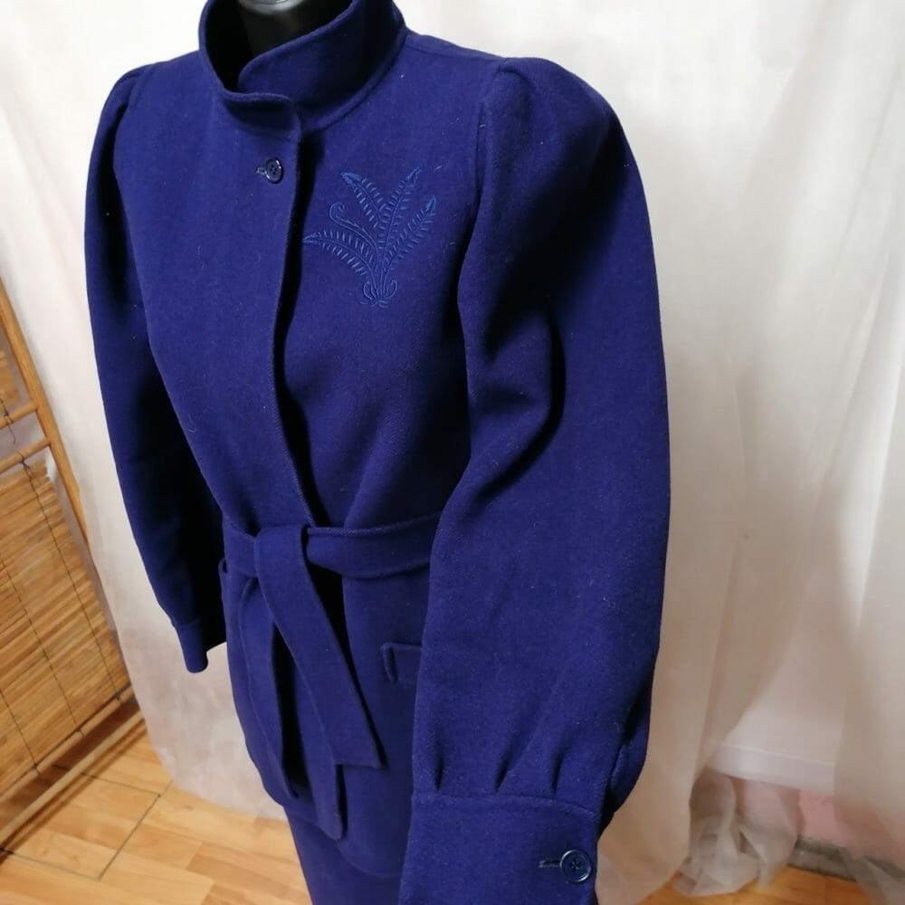 Completo giacca e gonna blu invernale, marca Ascam. Materiale non riportato ma sicuramente lana, pesante morbida e calda. La gonna è foderata e chiude con bottone e zip.