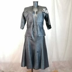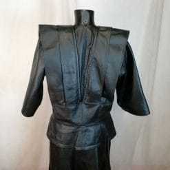 Completo in pelle anni 80 nero, da donna. Il giacchino ha un taglio particolarissimo, è avvitato e si lascia aperto, valorizzato del fazzoletto animalier nel micro taschino apposito (si può togliere o cambiare per abbinarlo all’outfit). Maniche tre quarti, spalle ampie che donano alla schiena la classica forma a V.