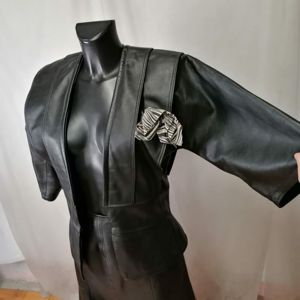 Completo in pelle anni 80 nero, da donna. Il giacchino ha un taglio particolarissimo, è avvitato e si lascia aperto, valorizzato del fazzoletto animalier nel micro taschino apposito (si può togliere o cambiare per abbinarlo all’outfit). Maniche tre quarti, spalle ampie che donano alla schiena la classica forma a V.