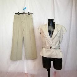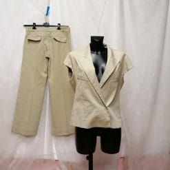Bellissimo completo composto da casacca senza maniche, chiusura con bottoni a pressione e cintura, passanti in vita anche dietro, fodera in acetato.
