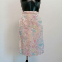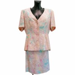 Completo primaverile sartoriale, tailleur anni 80 sui toni del rosa, composto da gonna dritta e giacca con spalle imbottite e bottoni effetto madreperla.