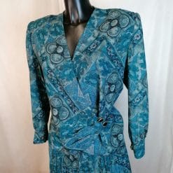 Può tranquillamente sostituire il tailleur al lavoro o vestire per un pomeriggio di shopping questo completo sui toni del blu e dell’azzurro, con giacca incrociata e gonna a pieghe. Molto belli i bottoni e il taglio della giacca con allacciatura sul fianco.