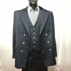 Un completo di un intenso blu con bottoni dorati decorati dall’ancora. Pantalone, gilet e pantaloni sono stati confezionati dalla Sartoria Marina Militare per un ensemble di grande eleganza.