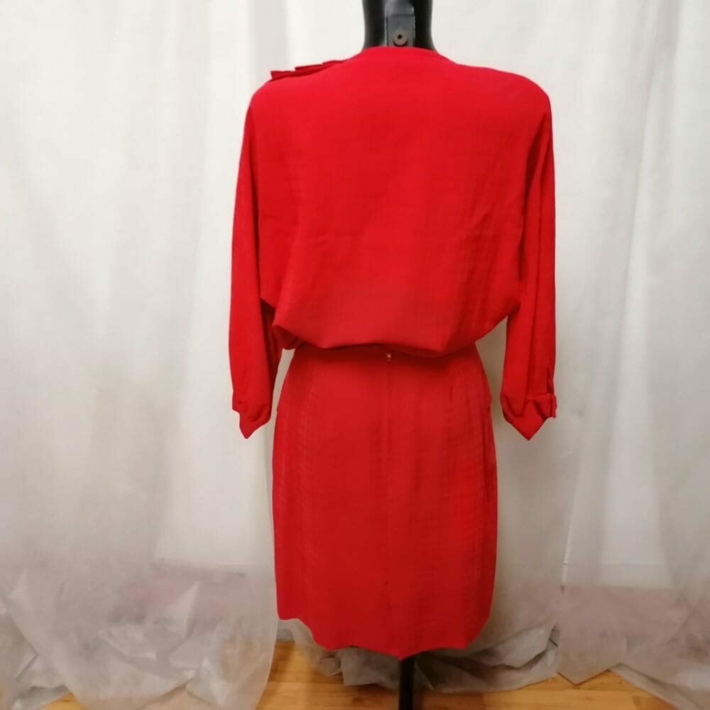 Questo capo second-hand si distingue innanzitutto per il ben tono di rosso brillante, e poi per il taglio particolarissimo dato dalla sovrapposizione di pannelli di tessuto, che anche grazie all’alternanza di materiale opaco e lucido, creano un bellissimo movimento.
