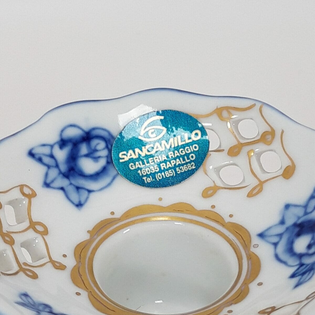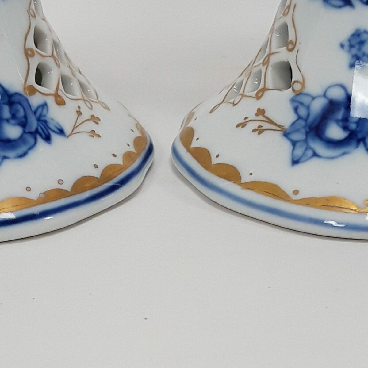 Coppia di candelieri in ceramica porcellana della manifattura “La Reine” – Francia, dal classico decoro bianco e blu a motivo floreale. La base è lavorata per dare l’effetto traforo che impreziosisce l’oggetto. I candelieri, alti 12cm, sono in ottime condizioni generali, ben puliti e senza evidenti difetti.