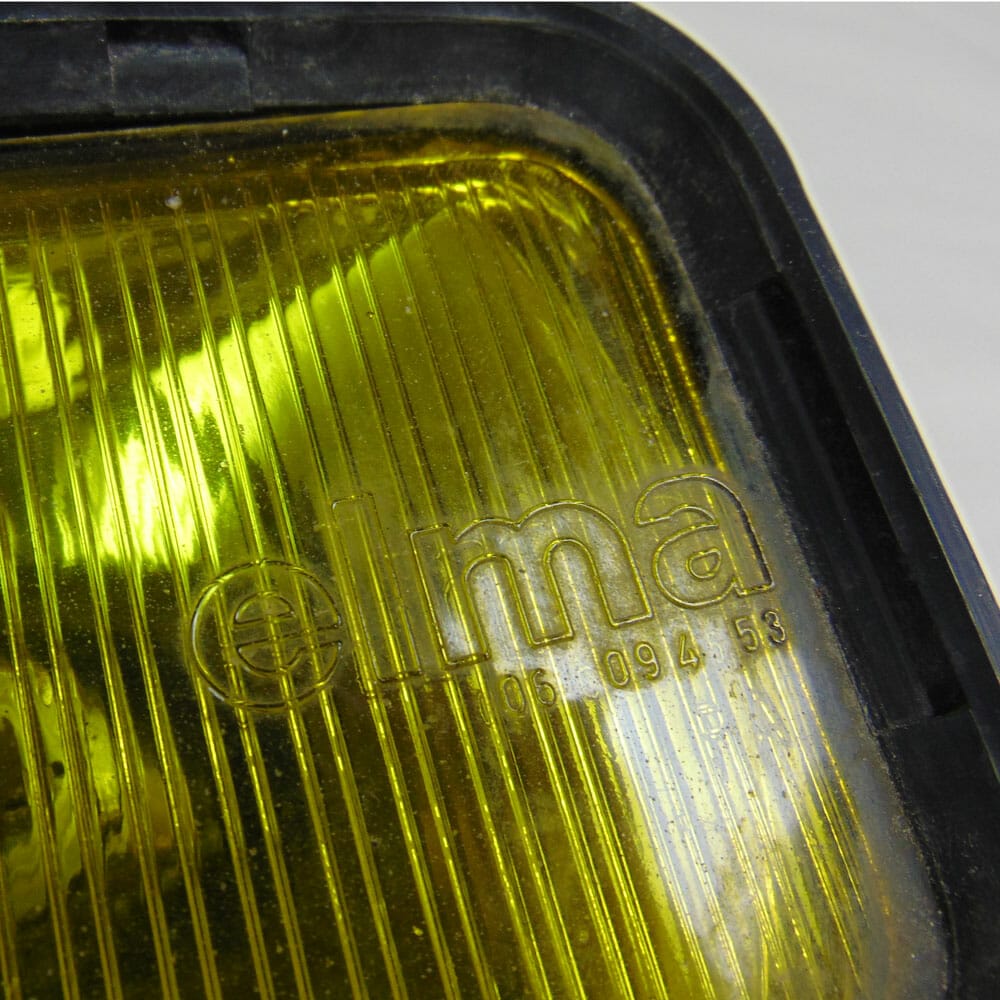 Coppia di fari antinebbia originali Elma, con gemma in vetro giallo e guaina in resistente gomma nera. Sono dotati di supporti in ferro. Non testati, ma alla vista si prensentano in ottime condizioni.