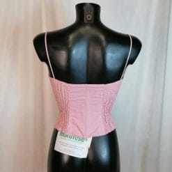 Corpetto rosa in cotone 43% lino 57 % con tre stecche e lavorazione smock. Chiusura con bottoncini.