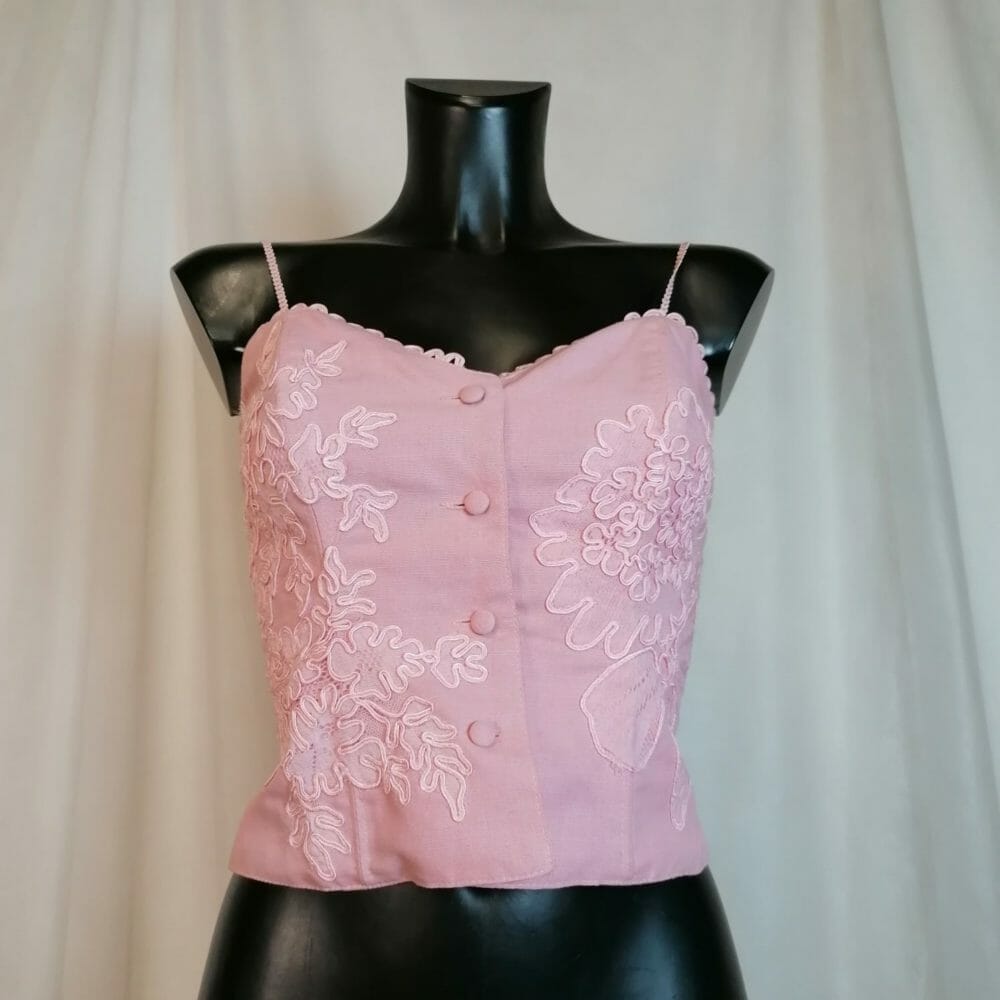 Ricami particolari e stecche semi-rigide che valorizzano le forme caratterizzano questo bustino rosa in lino e cotone. Rifinito da bottoncini ricoperti, segue bene le linee del corpo grazie alle parti elasticizzate poste posteriormente. Perfetto per un fisico minuto.