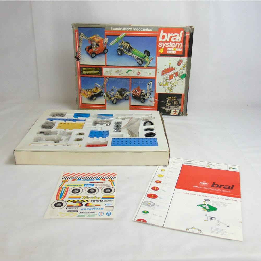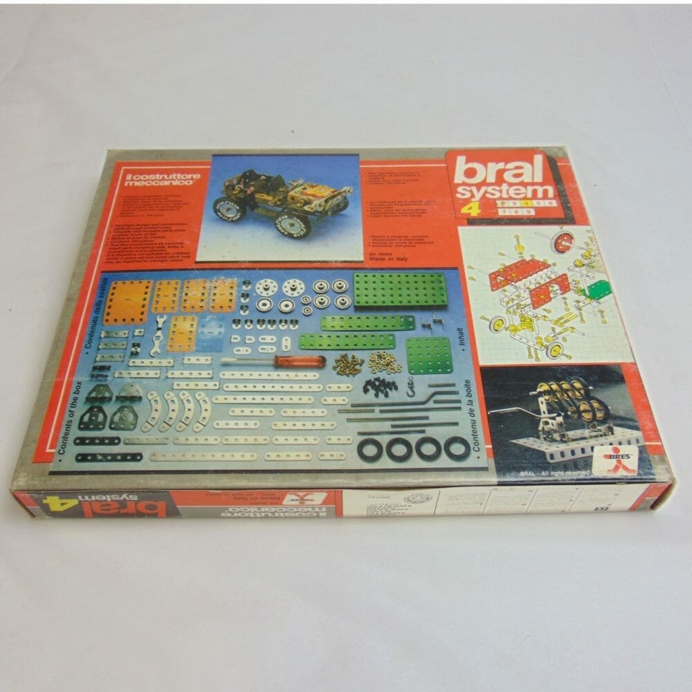 Lo storico Costruttore Meccanico Bral in una versione degli anni ’80. Completo e in buone condizioni generali, manca solo il manuale con i modelli da costruire. Scatola integra, con qualche segno di usura.