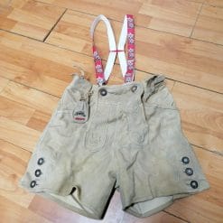 Calzoncini in scamosciato lederhose con bottoni di legno, ricami e bretelle con stelle alpine Country Maddox