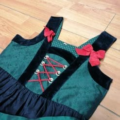 Vestito in cotone con dettagli in ciniglia e grambiule in poly, verde rosso e nero.