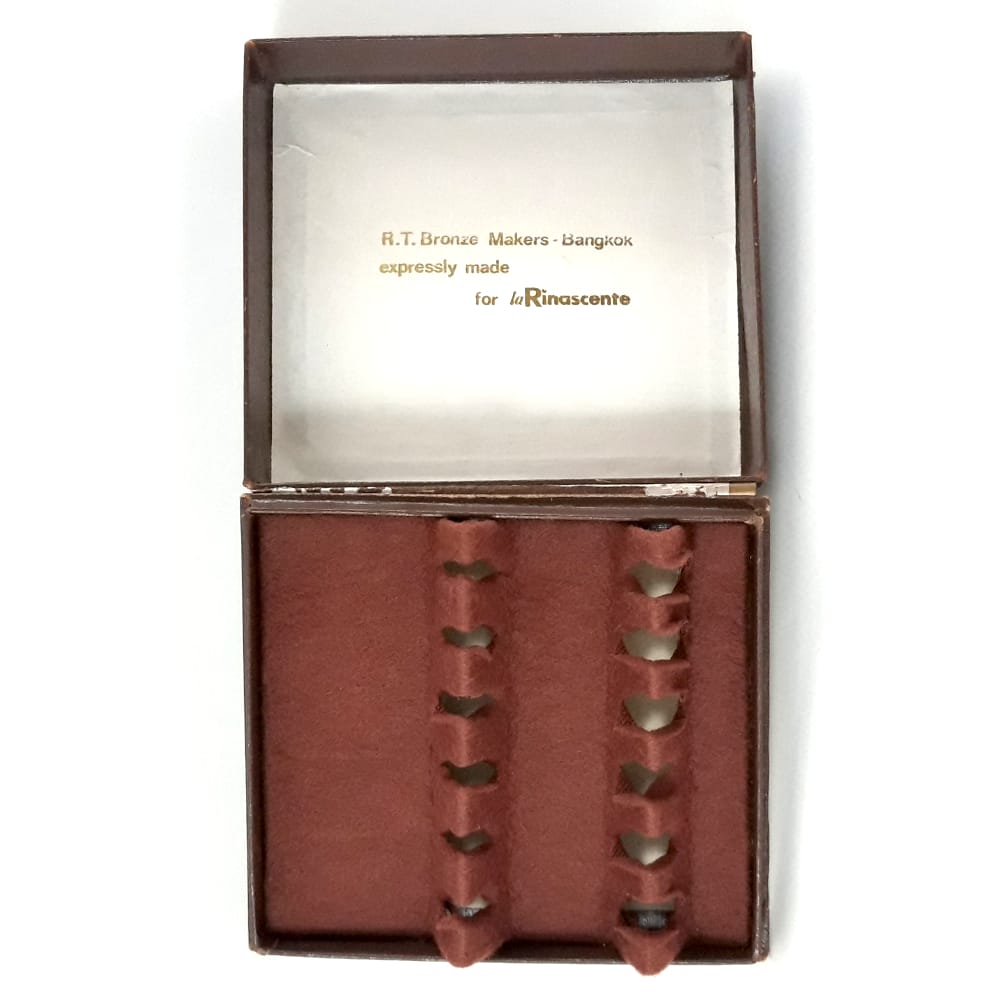 Bellissimo set di piccoli cucchiaini in ottone realizzati per “laRinascente”. Paletta in metallo con manico in legno dalle finiture pregiate; misurano circa 10cm, ideali per servire aperitivi o per il caffรจ. Viene venduto con la relativa scatola originale. L’oggetto รจ in ottime condizioni generali, scatola e cucchiaini non hanno difetti e sono ben puliti ed ancora confezionati. Non รจ necessaria una lucidatura prima dell’uso, le possibili ombre (eventuali) del metallo li rendono piรน apprezzabili.
