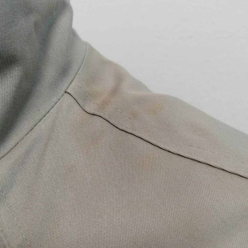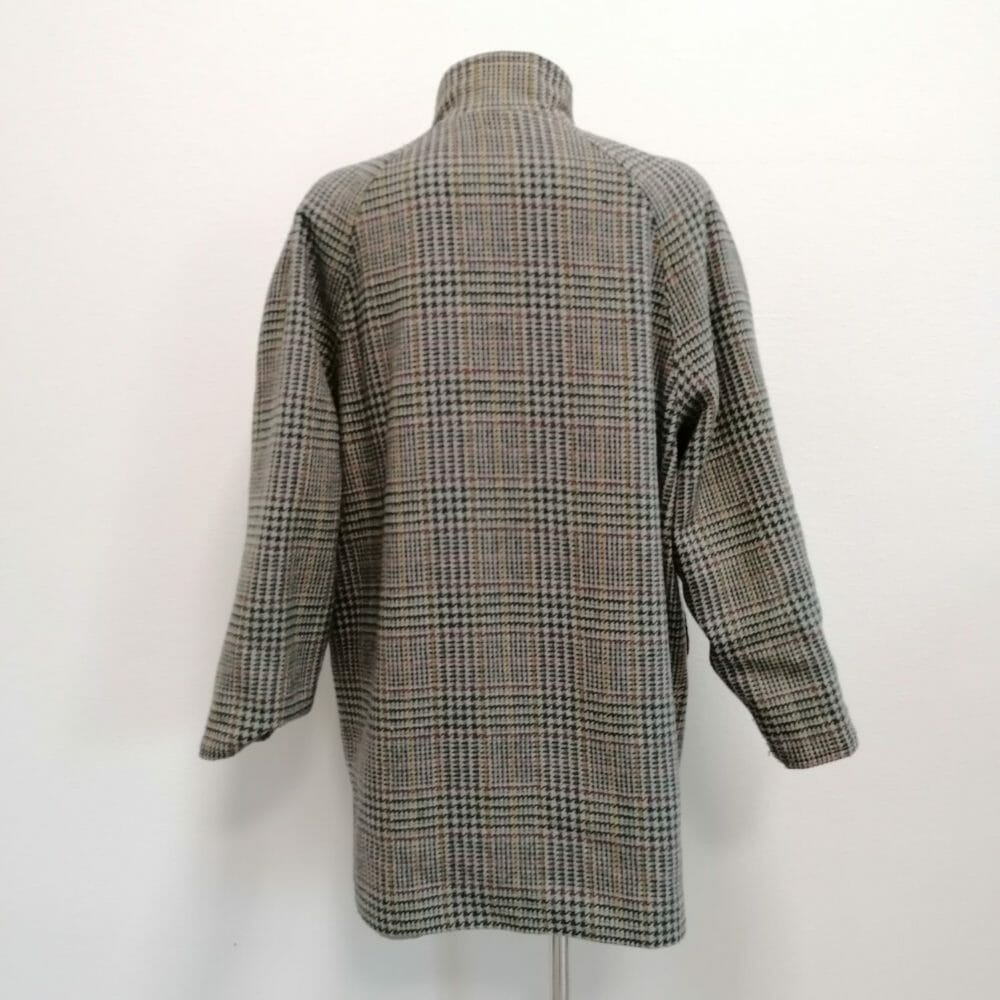 Double face giacca doppiopetto vintage, cappotto di lana da un lato e impermeabile grigio dall’altro. Spalle raglan, taglio dritto e ampio. Ottima fattura, capo dettagliato e ben rifinito.