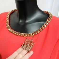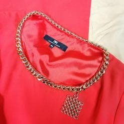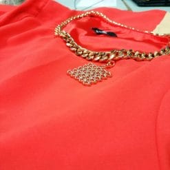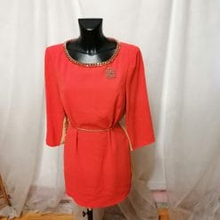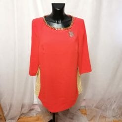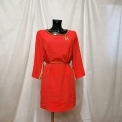 Elisabetta Franchi vestito arancione con dettagli metallici e particolari pannelli laterali beige.
