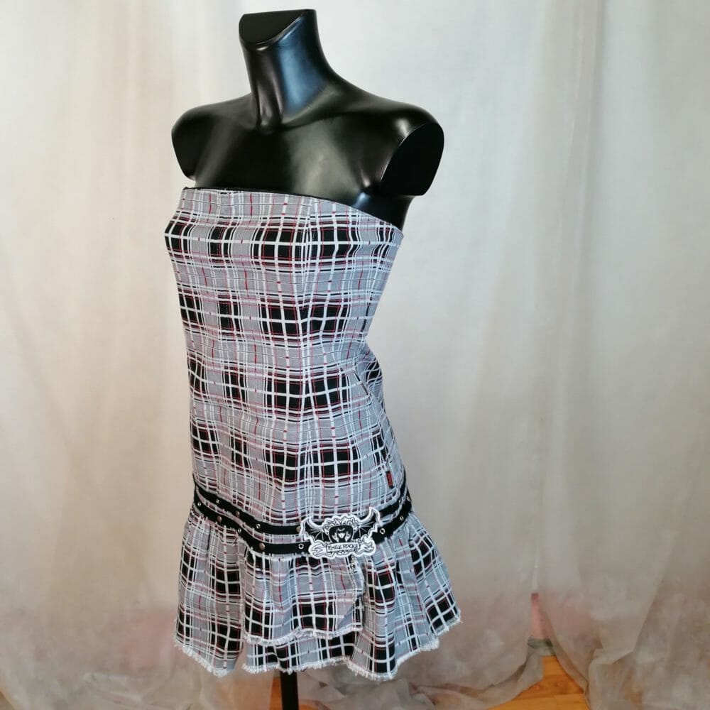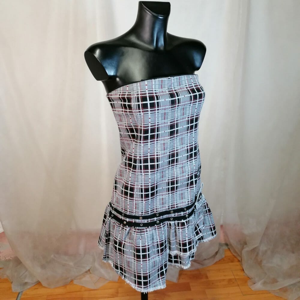 Questo proposto è un vestito praticamente nuovo di riuso, di chiaro richiamo punk sia nella scelta del tessuto tartan che nell’asimmetria del taglio. Decorato con una toppa sempre di Emily e una catenina sulla fettuccia con borchie.