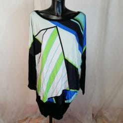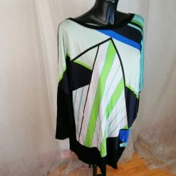 Fiorella Rubino, brand leader nell’abbigliamento curvy, abito vintage asimmetrico a uovo, maniche a pipistrello (una più dell’altra) e scollo ampio da portare con una spalla scoperta. Cotone la parte nera, poliestere la parte colorata. Elasticizzato. Anni 80.