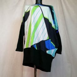 Fiorella Rubino, brand leader nell’abbigliamento curvy, abito vintage asimmetrico a uovo, maniche a pipistrello (una più dell’altra) e scollo ampio da portare con una spalla scoperta. Cotone la parte nera, poliestere la parte colorata. Elasticizzato. Anni 80.