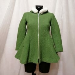 Giacca di lana verde con cappuccio e finto pelo bianco