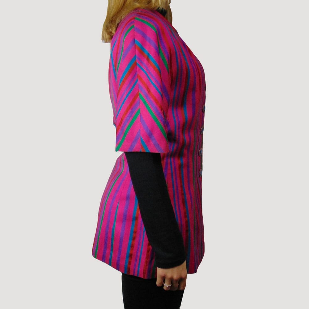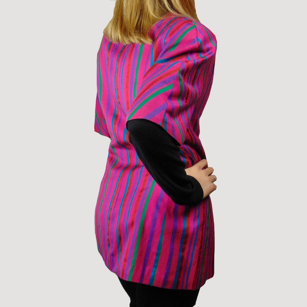 Giacca a maniche corte degli anni’80 in shantung di seta stampato a righe verticali. Taglia 42, con chiusura a 5 bottoni e spalline imbottite, cade bene lungo i fianchi. Di fattura sartoriale, foderata e in ottime condizioni, come nuovo.