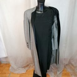 Gianfranco Ferrè soprabito con cucito all’interno abito. Un capo vintage anni 80 unico, raffinatissimo soprabito in lana 100% con rever lucidi, all’interno è cucita la parte frontale di un abito con allacciatura su una spalla, in rayon nero.