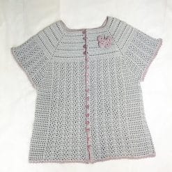 Prezioso e raro gilet vintage realizzato completamente a mano all’uncinetto. Taglia M, è realizzato in puro cotone grigio perla con profili lilla e spilla removibile a forma di farfalla, per impreziosire il tutto. Il pezzo è realizzato con grande abilità e precisione ed è perfetto per dare un tono romantic-chic ai vostri outfit.