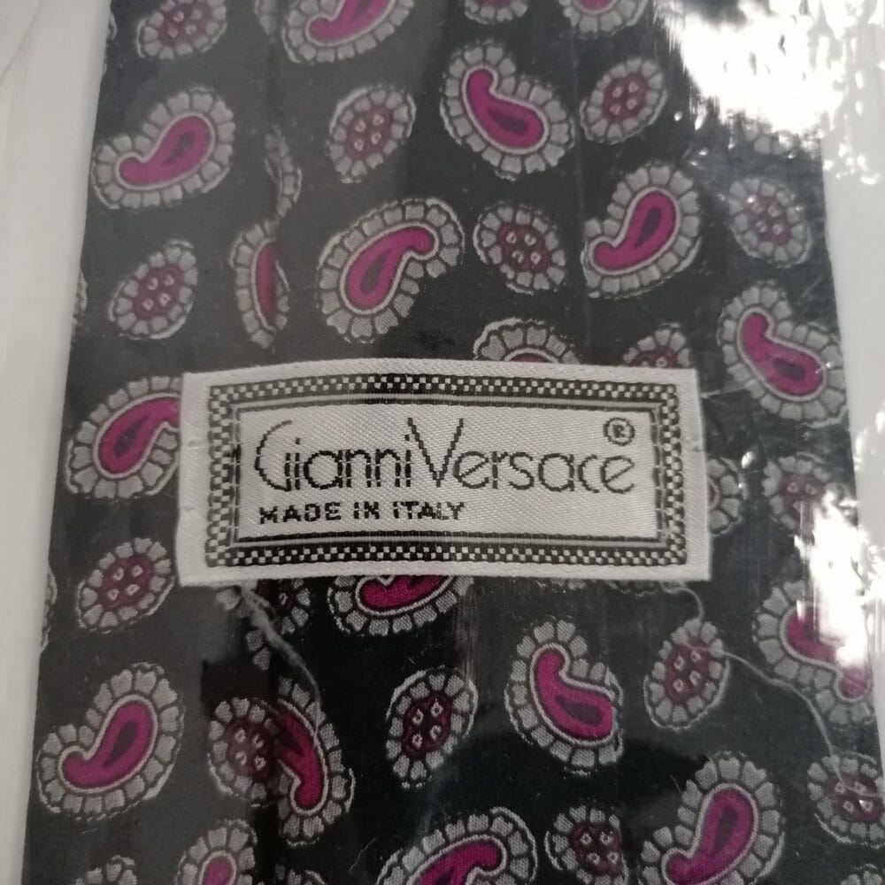 Cravatta Gianni Versace vintage in seta, vivace grazie agli accenti rosa su fondo blu molto scuro, ma meno vistosa ed eccentrica di altre fantasie tipiche di questo marchio. Semplice da abbinare, perfetta per i collezionisti del brand Versace.