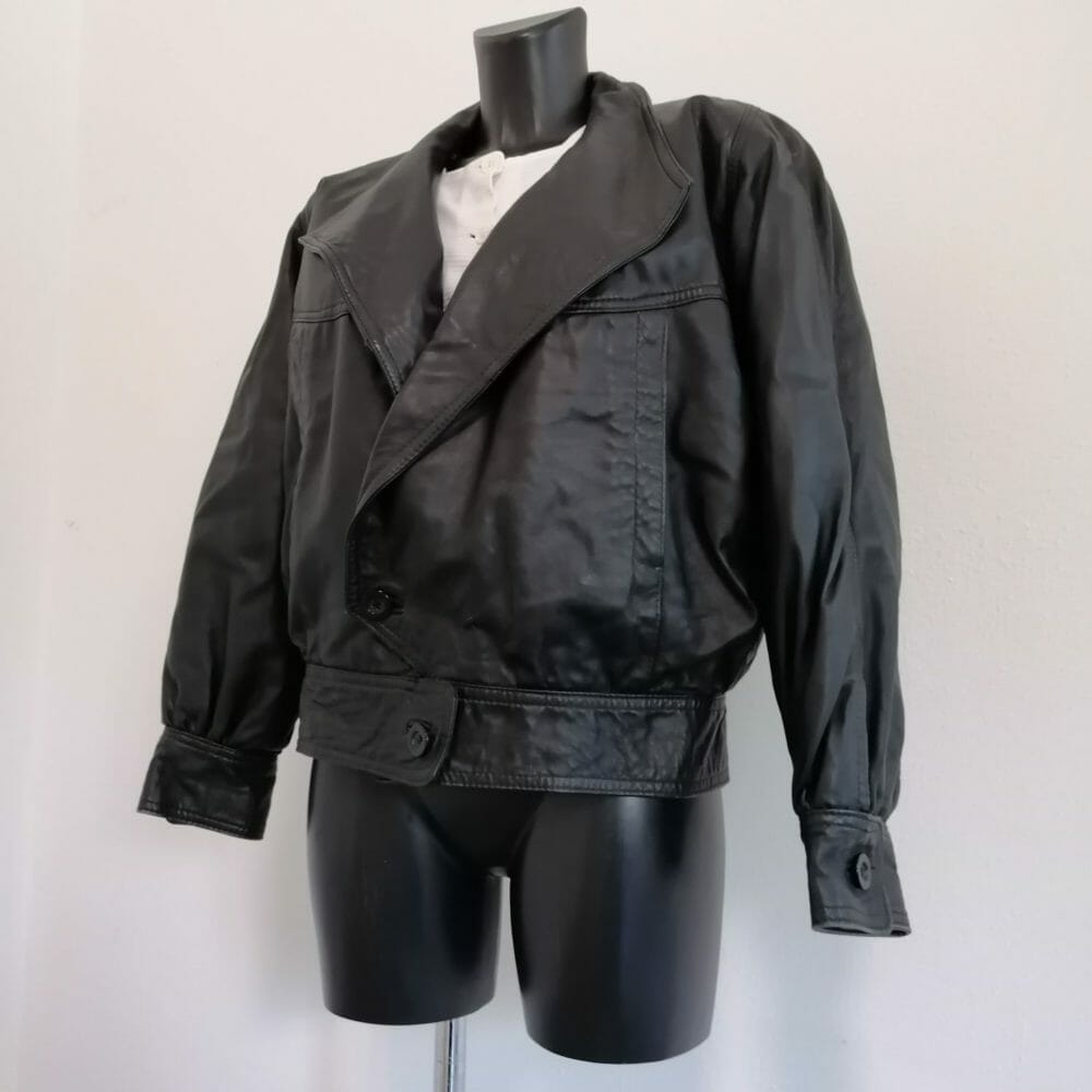 Direttamente dagli anni 80 un giubbotto di pelle con due bottoni e allacciatura incrociata, maniche molto ampie e volumi caratteristici. Belli i due grandi revers.
