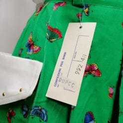 Gonna di cotone a costine tipo fustagno, verde prato con farfalle e tasche bianche con borchiette.