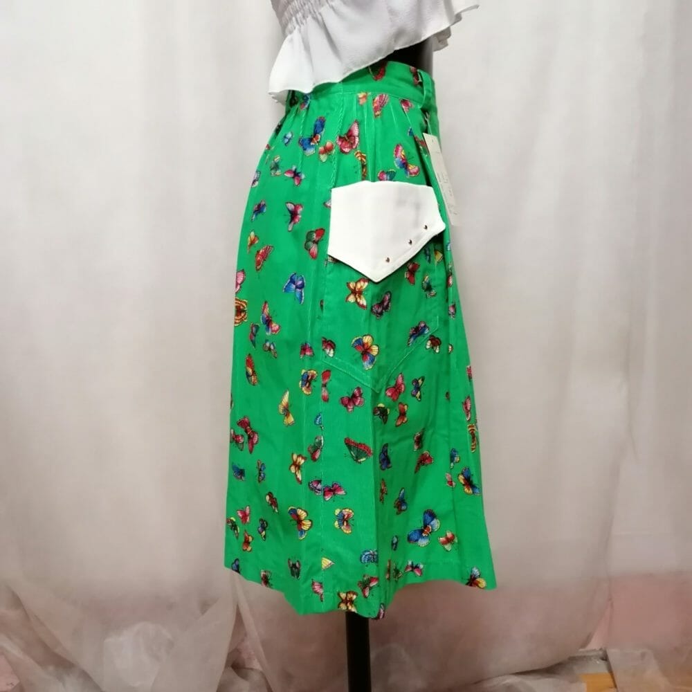Gonna di cotone a costine tipo fustagno, verde prato con farfalle e tasche bianche con borchiette.