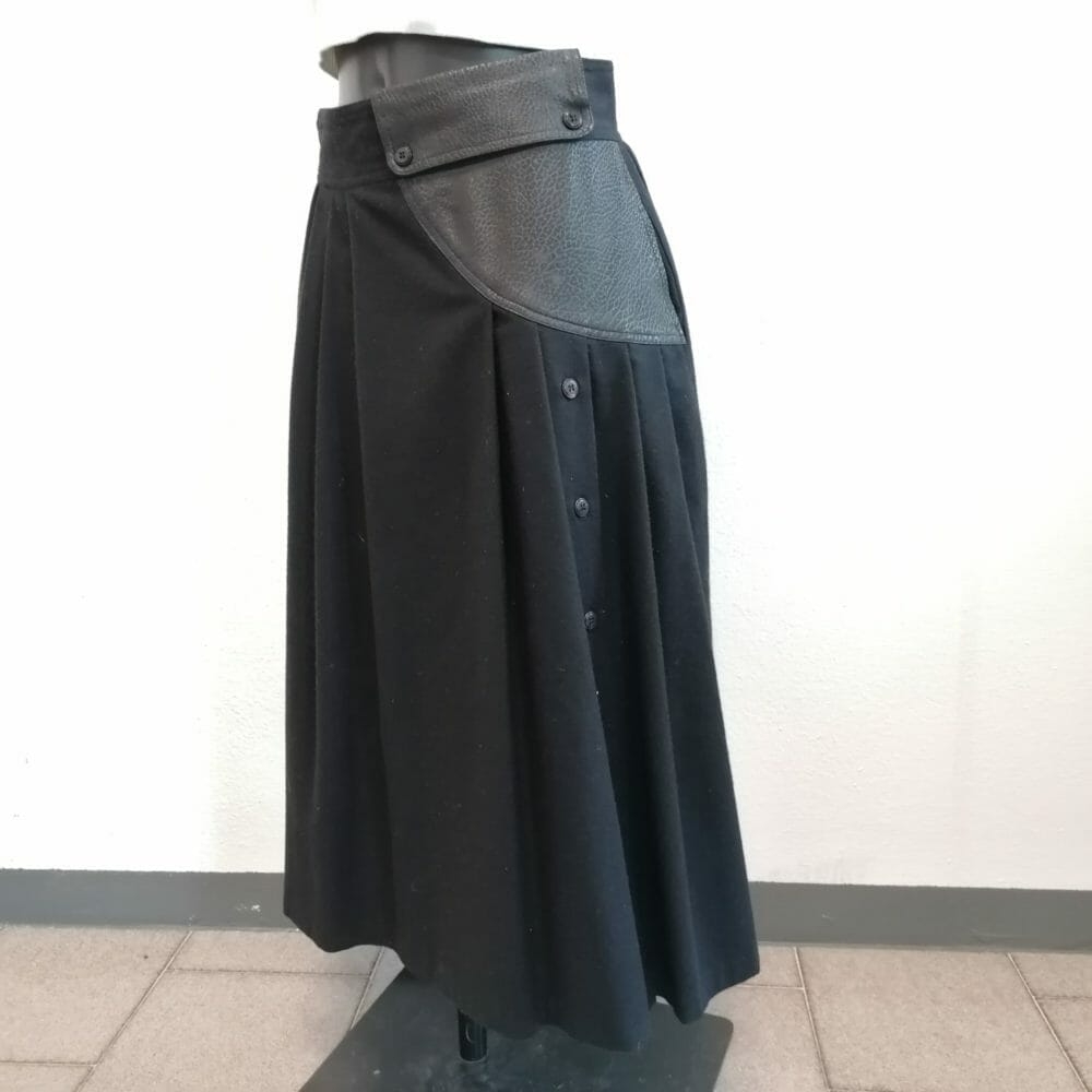 Gonna vintage nera in lana 65% strutturata, ha inserto in ecopelle con funzione di passante, due tasche capienti laterali e invisibili. Lunga fila di bottoni che permette di regolare un eventuale spacco.