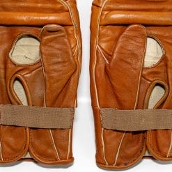 Questi guantoni da boxe vintage sono realizzati in robusta pelle marrone chiaro, un materiale che conferisce loro un fascino inconfondibile. Simili al famoso modello “Il Messicano”, erano originariamente destinati all’allenamento al sacco. Il logo del marchio “Leone” e la scritta “lofas-sprint” sono presenti su un pezzo di stoffa cucita.