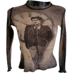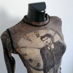Scopri l’iconica maglia a manica lunga Jean-Paul Gaultier anni ’90, un capo raro e collezionabile. Realizzata in collaborazione tra lo stilista Jean-Paul Gaultier e AnnaMaria Fuzzi, regina della maglieria romagnola, questa maglia è caratterizzata da un design punk girl with clock.