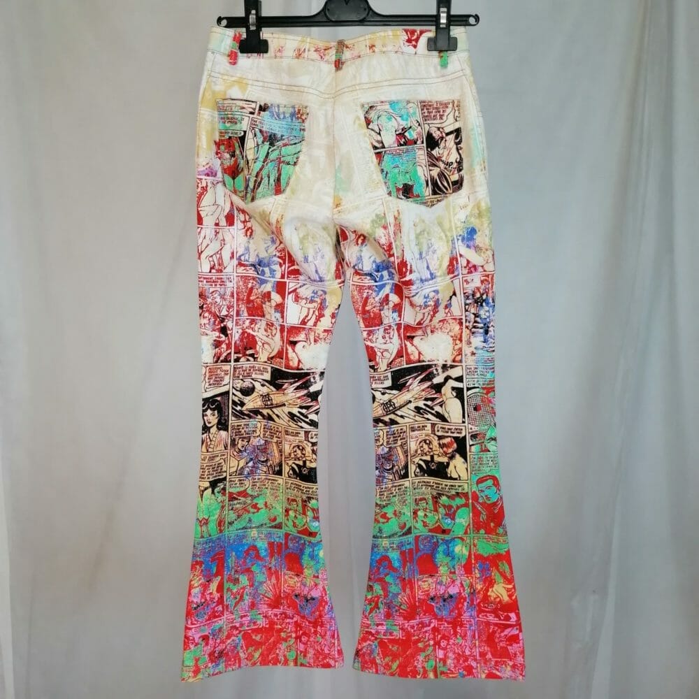 Pantaloni in denim un po’ elasticizzato, leggeri, sartoriali, realizzati con tessuto a fumetti in colori psichedelici.