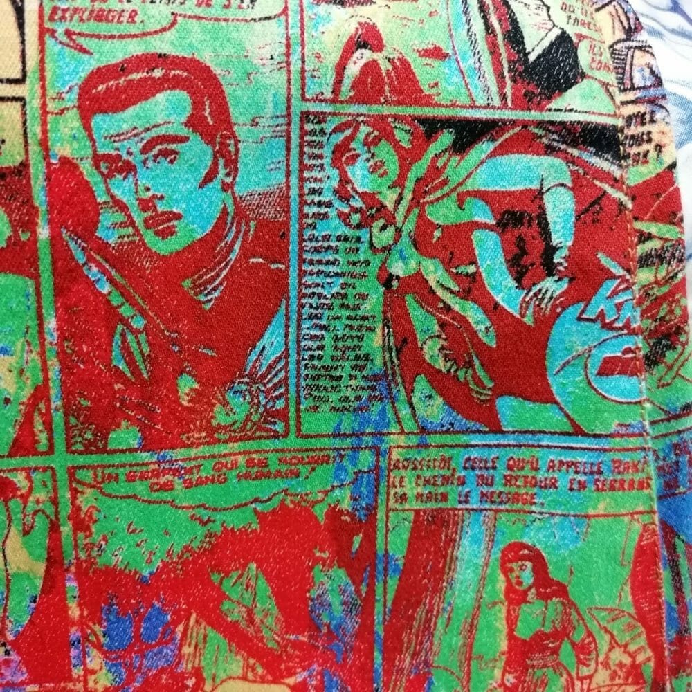 Un capo fatto a mano veramente unico: la stampa infatti riprende alcune vignette di un fumetto in francese ed è proposta in tinte acide e sgargiantissime. Pantaloni leggeri ma soprattutto inimitabili per un look che è davvero personale. Handmade di alta qualità.